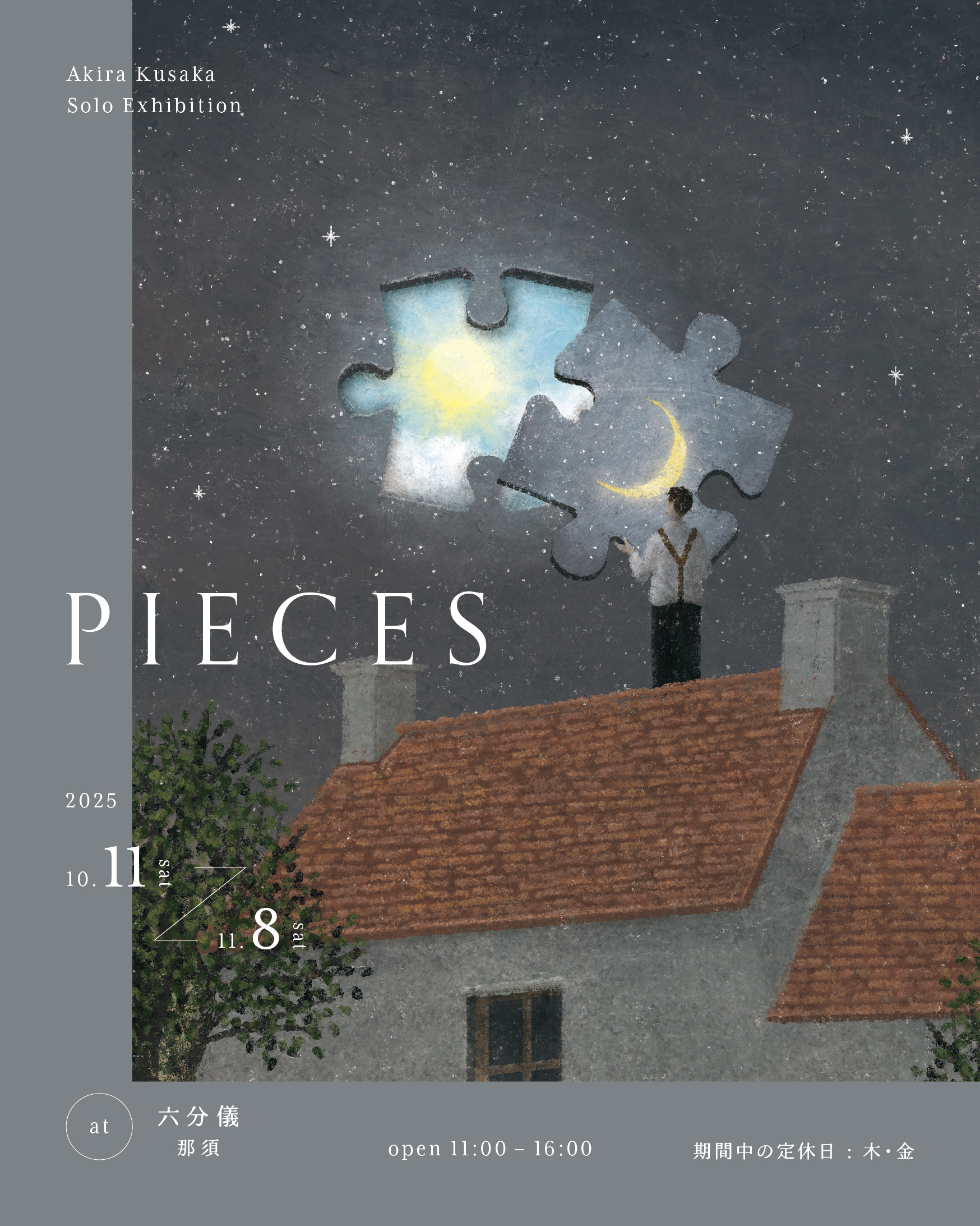 パズルのピースがはまるように、自分の作品が誰かの心情にマッチできればいいなと想い、「PICIES」というタイトルになりました。様々な物語を感じる作品を中心に、新作・旧作織り交ぜて展示いたします。空想の欠片を集めるようにお楽しみいただけたら幸いです。