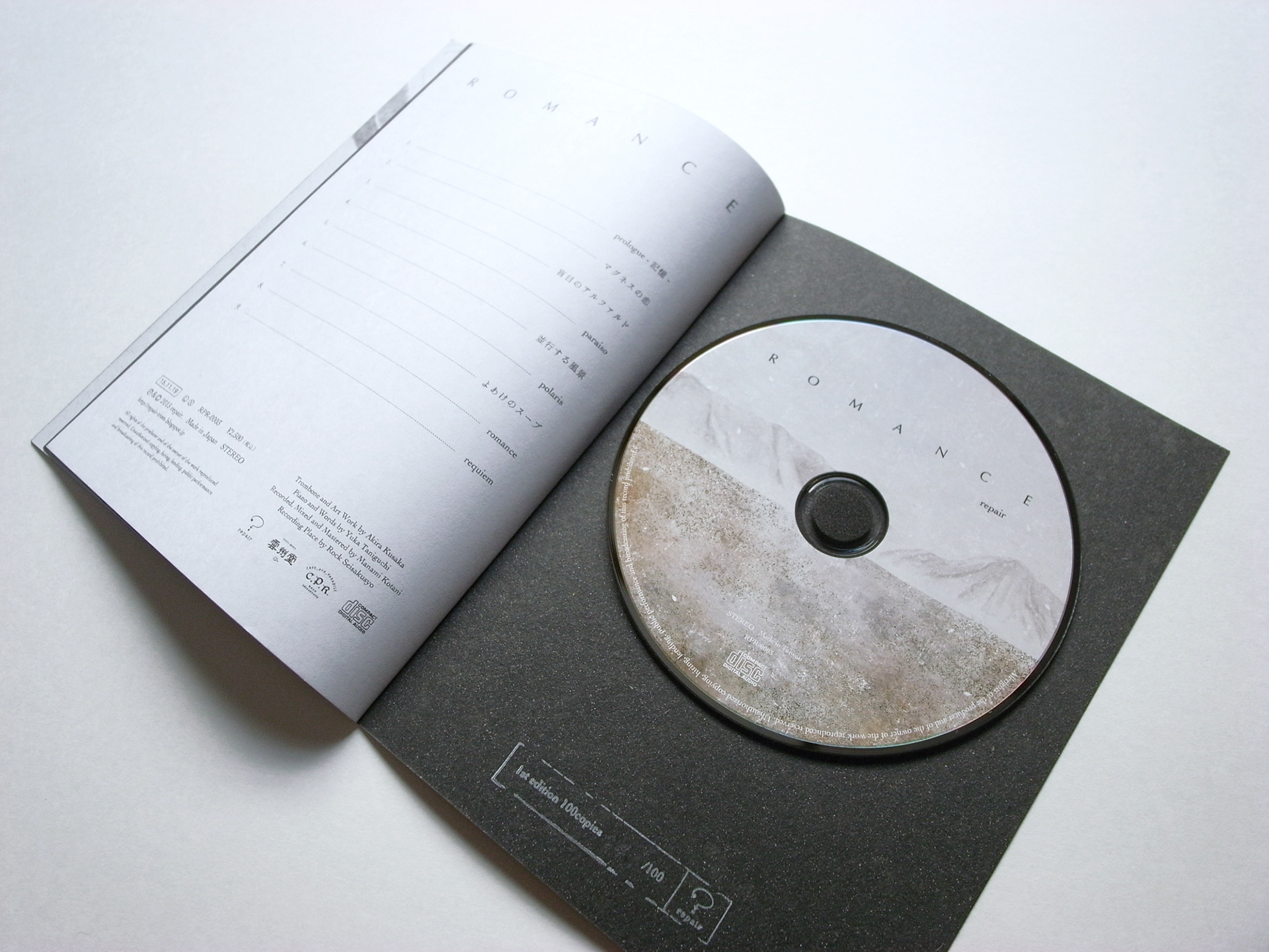 自身が所属する絵と音と言葉のユニット「repair」の3rd album。bookタイプになっていて、架空の映画「ROMANCE」のサントラというコンセプト。物語に沿って音楽を楽しんでいただく仕様になっています。
